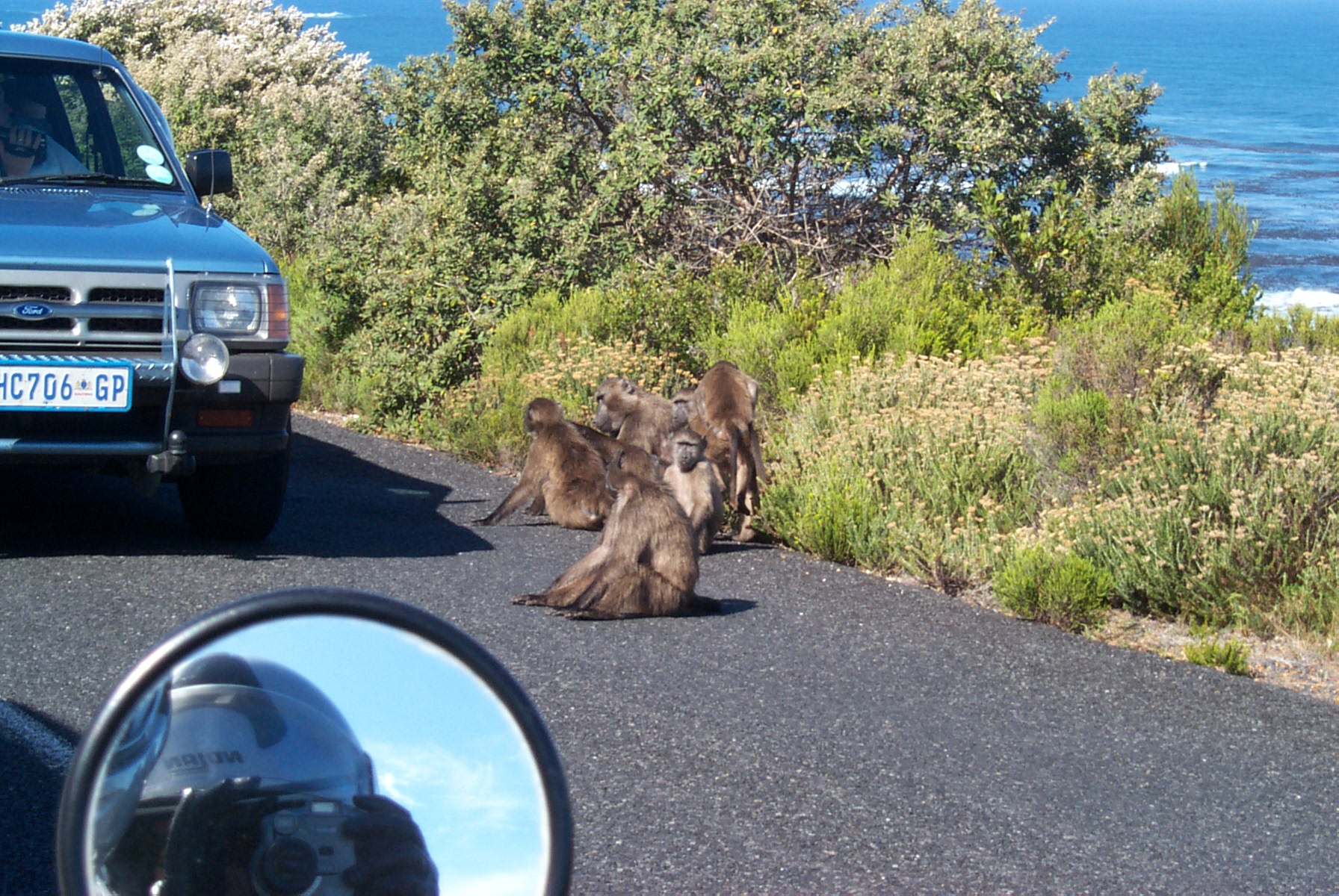![]() Baboon in the road, causing quite a traffic jam Tue Jan 5, 1999 Cape Point National Park, South Africa File size: 39k (805k) |