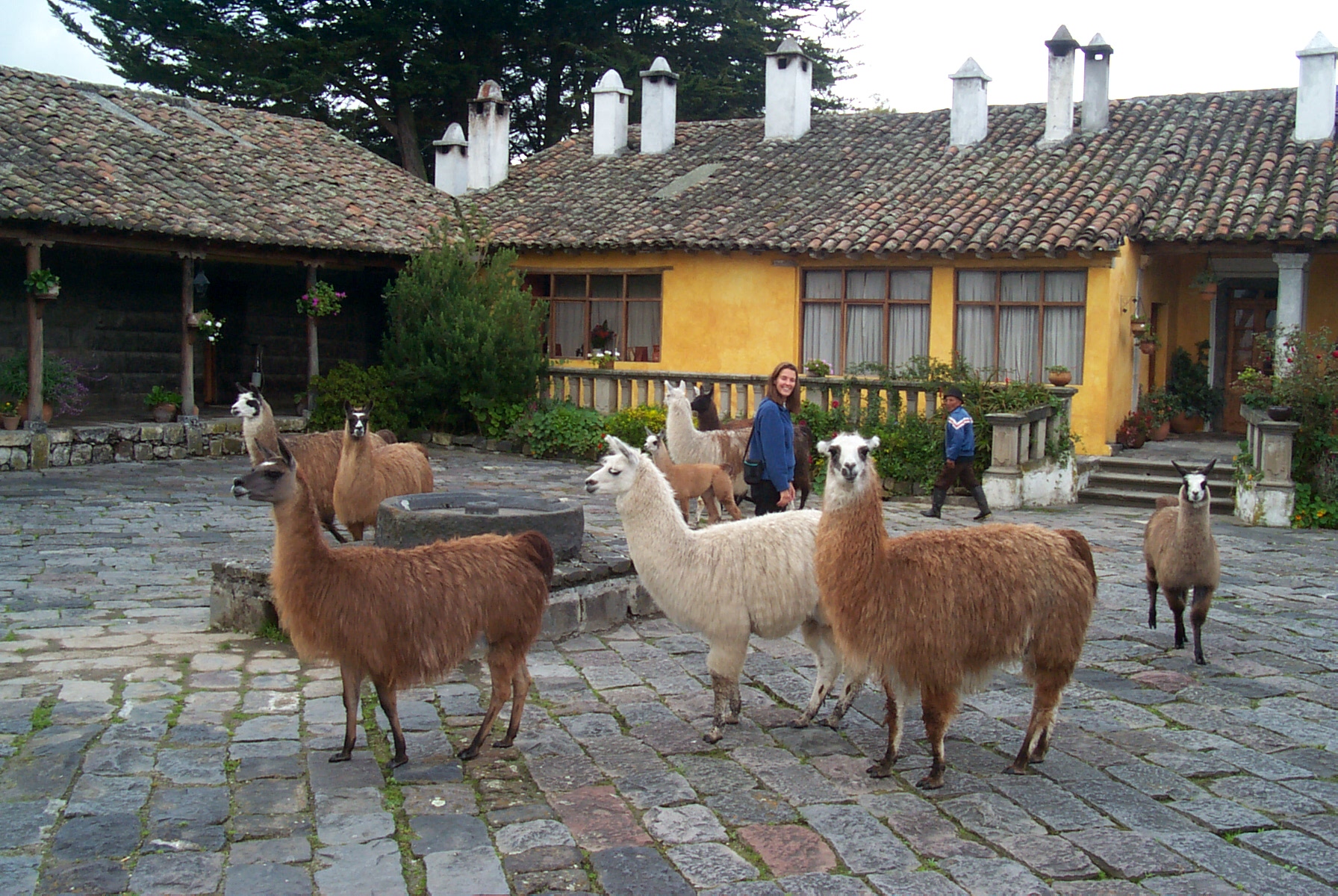 Louisa watches llamas in the courtyard Mon Jun 5, 2000 Hacienda San Augustin de Callo, near Cotopaxi, Ecuador |