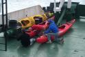 Al, Peter, and Matt preparing the kayaks Sat Dec 9, 2000 Drake Passage, Antarctic Ocean |