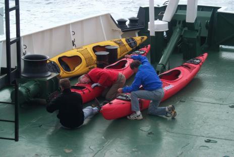 ![]() Al, Peter, and Matt preparing the kayaks Sat Dec 9, 2000 Drake Passage, Antarctic Ocean File size: 24k (436k) |